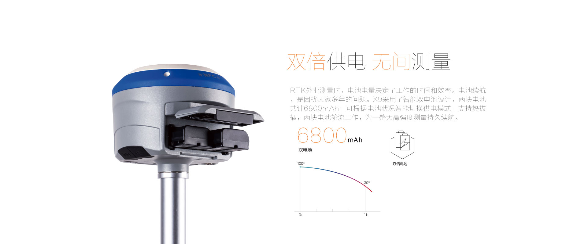 RTK模式12小時,可外接直流電,雙電池電源自動切換 |